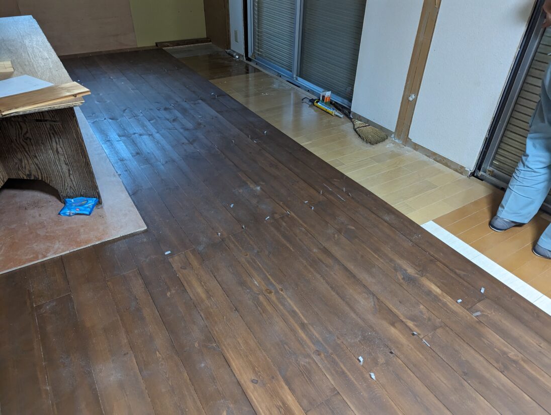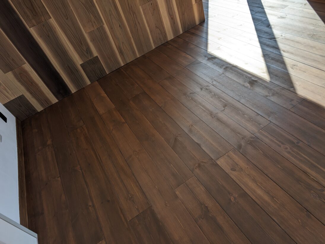 床が複合フローリングでしたので、無垢パインフローリングを上貼りすることをご提案。