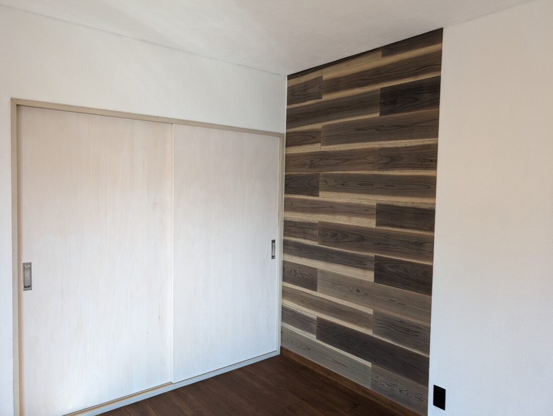 アクセントとして杉足場板5mmを貼付け。ウッドロングエコで塗装し、経年変化した風合いを出しました。またキッチンカウンターの壁も同じ仕上げでしたので、統一感を持たせました。